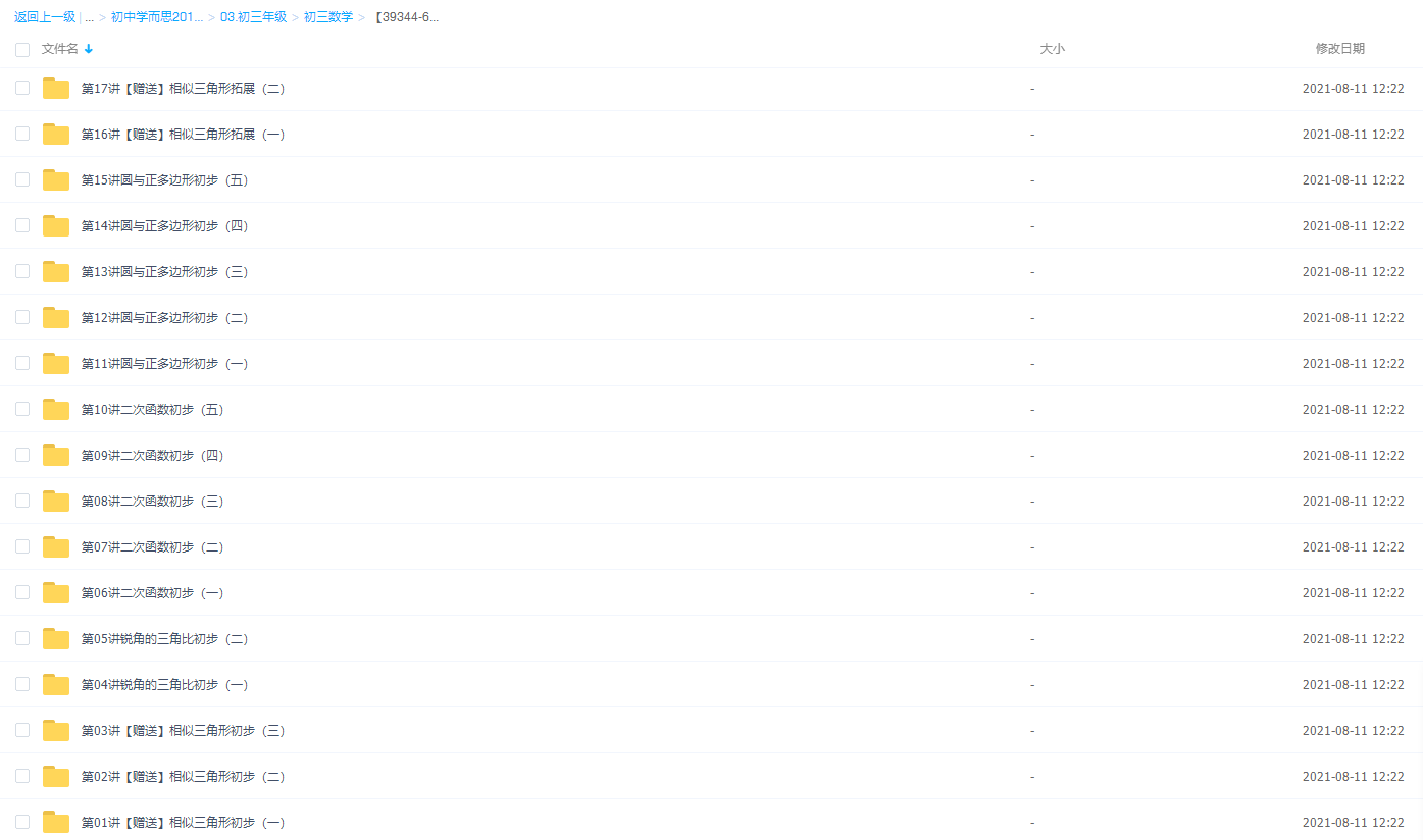 此课件来自学而思网校,【39344-64讲】初三数学年卡提高班(上海沪教版)【朱韬】,包含视频课程和讲义资料 。此课件的主要内容包括: 相似之成比例线段知识点、寒假目标中考系统复习之四边形、寒假目标中考系统复习之二次函数、图形变换与动手操作、寒假目标中考系统复习之一次函数与反比例函数、二次函数的图像及基本性质、寒假目标中考系统复习之代数几何综合、相似之相似三角形的性质与判定 等等视频