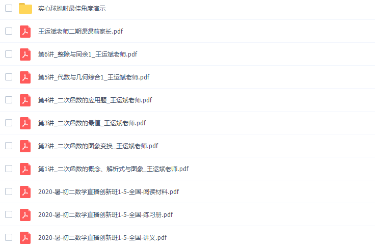 此课件来自学而思网校,王运斌初二数学初一升初二数学2020年暑假班全国版课程。此课件主要知识点包括:二次函数的解析式、二次函数的图象与性质、二次函数的图象变换、二次函数的最值、函数应用题、代数与几何综合、整除与同余、不定方程。。
