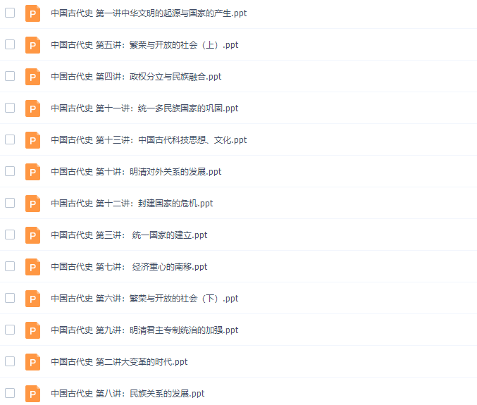 此课件来自学科网中国古代史专题课程高清视频,此课件主要知识点包括:中华文明的起源与国家的产生、大变革的时代、统一国家的建立、政权分立与民族融合、繁荣与开放的社会、经济重心的南移、民族关系的发展、明清君主专制统治的加强、明清对外关系的发展、统一多民族国家的巩固、封建国家的危机、中国古代科技思想、文化。。