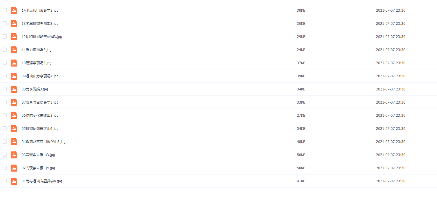 1、声现象:声音的产生与传播、我们怎么听到声音、声音的特性、噪声的危害和控制、声的利用。2、光现象:光的传播、光的反射、平面镜成像、光的折射、光的色散、看不见的光。3、透镜及其应用:透镜、生活中透镜、探究凸透镜成像的规律、眼睛和眼镜、显微镜和望远镜。4、物态变化:温度计、熔化和凝固、汽化和液化、升华和凝华5、电流和电路:电荷、电流和电路、串联和并联、电流的强弱、探究串、并联电路中电流的规律6、电压电阻:电压、探究串、并联电路电压的规律、电阻、变阻器。7、欧姆定律:探究电阻上的电流跟两端电压的关系、欧姆定律及其应用、测量小灯泡的电阻、欧姆定律和安全用电。8、电功率:电能、电功率、电与热、电功率和安全用电、生活用电。9、电与磁:磁现象、磁场、电生磁、电磁铁、电磁继电器、扬声器、电动机、磁生电10、信息的传递:现代顺风耳──电话、电磁波的海洋、广播、电视和移动通信、越来越宽的信息之路。11、会看:例如,老师在空矿泉水瓶子的侧面不同高度处扎了几个小洞,将水倒入瓶中。你睁大了眼睛,像看电影一样,就怕漏掉哪个环节。做好实验,老师问观察到什么现象?集体回答“水喷出来了”。其实,还有一个答案,“越是下面的小洞水喷得越远”。两个现象,两个结论,而后一个更是研究重点。物理是以观察和实验为基础的一门学科,初中物理的实验更多,但实验不是看热闹的。