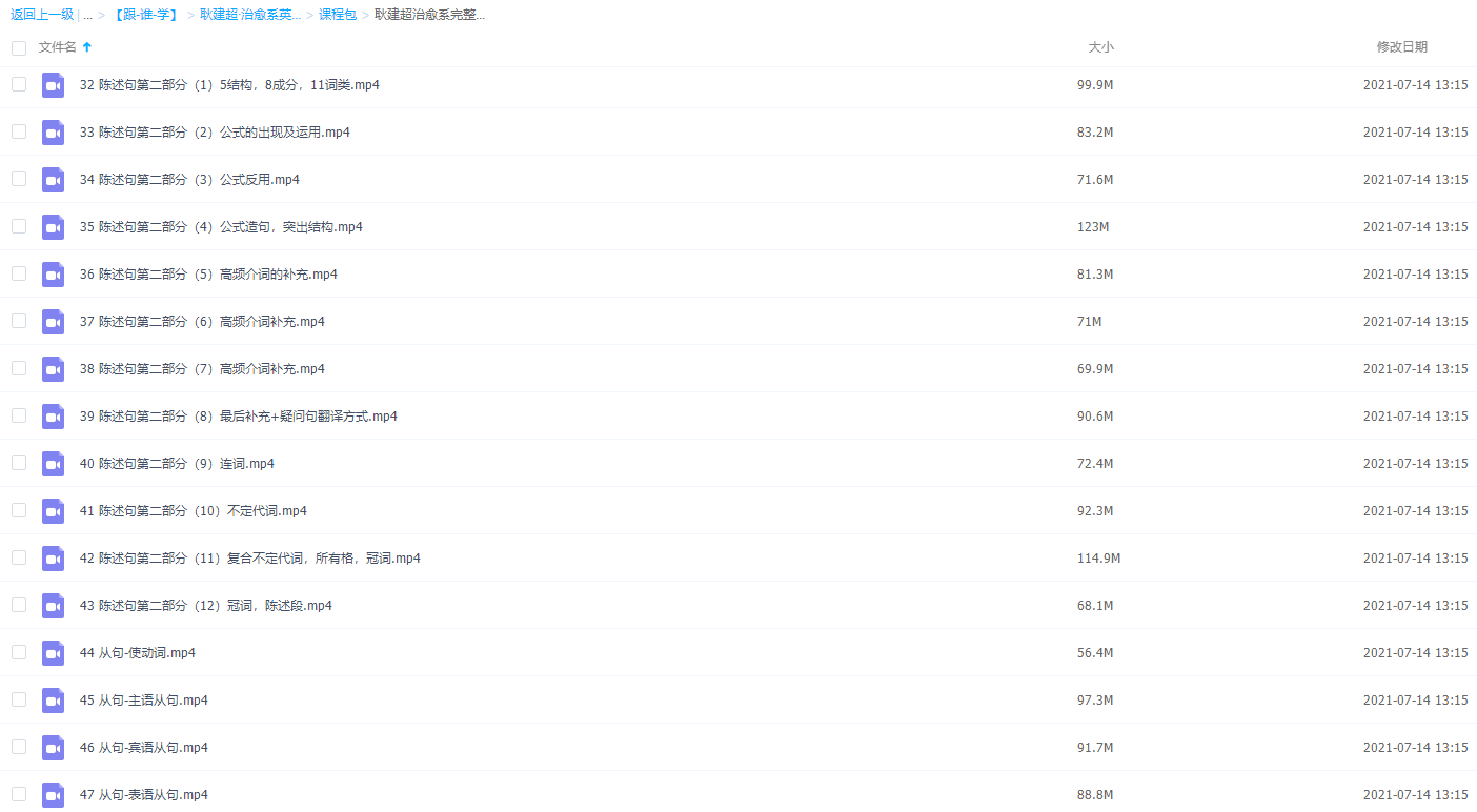 此课件来自跟谁学网校,耿建超治愈系英语七大体系八大节教学视频全集完整版。此课件主要知识点包括:音标、两小时记忆150单词、时态相关知识点、被动语态、情态动词、虚拟语气、陈述句、从句、非谓语动词、独立主格、强调句型、倒装句、现在完成时与现在完成进行时、副词与介…. .等等。治愈系英语为全中文教材,课后全部是中文句子,需要同学去造句翻译,然后只看中文,没有英语去练习反应速度!