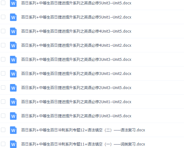 此课件来自《百日冲系列》英语中等生高考备考百日捷进Word版,此课件包含:书面表达、阅读填空、广告应用文、记叙文、从句复习、语法复习、词类复习。