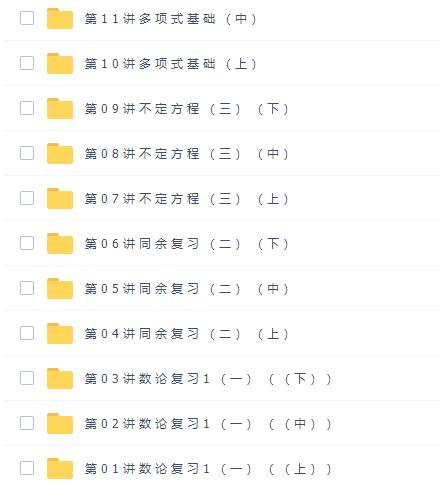 全国高中数学联赛竞赛遵循“课堂教学为主,课外活动为辅”的原则,此课件来自学而思网校,数学竞赛陈晨高二数学全国联赛班。此课件主要知识点包括:数论复习、同余复习、不定方程、多项式基础、二次剩余、数论综合问题等视频。