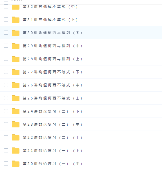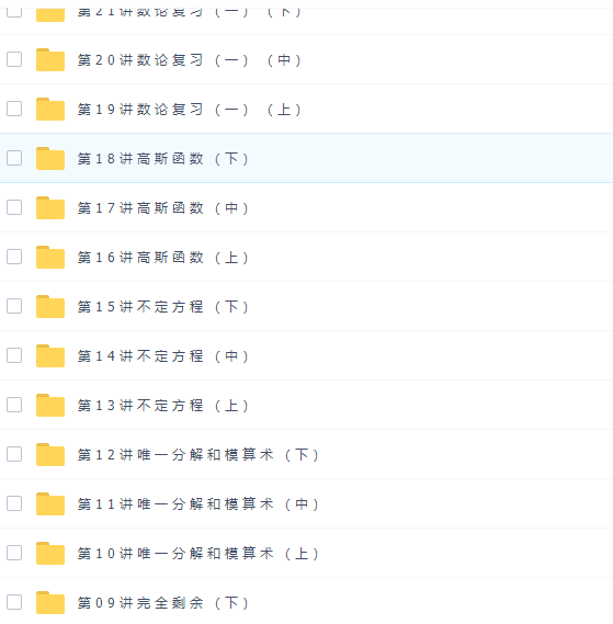 此课件来自学而思网校,高中奥数四阶高一全国高中数学联赛班陈晨完结。此课件主要知识点包括:整数基本性质、数论基础、完全剩余、唯一分解和模算术、不定方程、高斯函数、数论复习、均值柯西与排列、其他解不等式、不等式综合运用、向量、复数、组合。