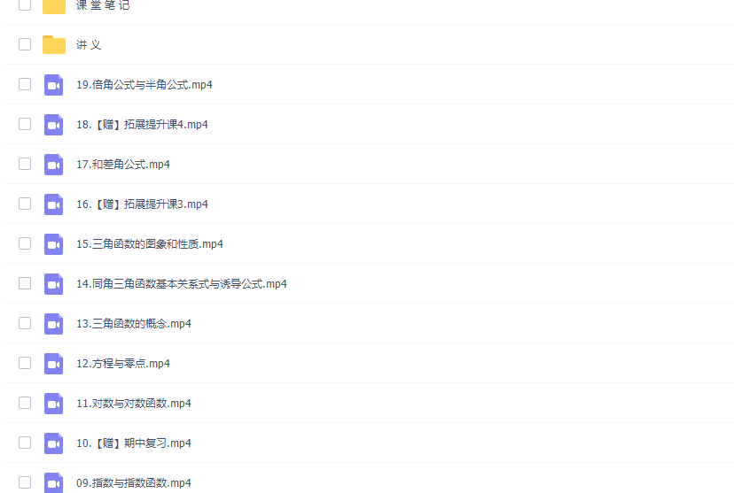 此课件来自作业帮网校,尹亮辉高一数学2021年秋季冲顶班课程。此课件主要知识点包括:集合中的6大天坑、不等式与基本不等式、二次函数、函数概念的8种考法、函数的单调性、函数的奇偶性与性质综合、指数与指数函数、对数与对数函数、方程与零点、三角函数的概念、同角三角函数基本关系式与诱导公式、三角函数的图象和性质、和差角公式、倍角公式与半角公式。