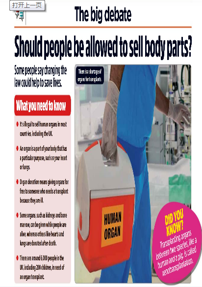 1 | Should people be allowed to sellbody parts? | 人们应该被允许出售身体器官吗?