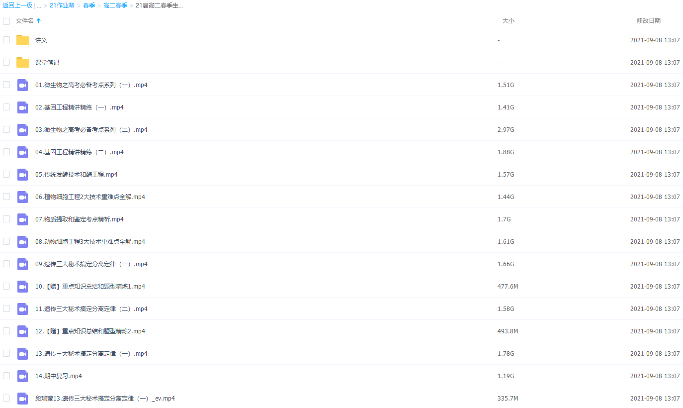 此课件来自作业帮网校,2021作业帮高二春季生物段瑞莹尖端直播课,包括课程视频回放以及资料讲义。主讲段瑞莹老师的课程中渗透培养学生“构建知识体系”的生物学习能力,教授学生合理“分类刷题”的做题练习方法,实现生物稳步提升,高考满分。打破生物“背”的旧观念,用清晰的课程逻辑,搭配简单易用的方法大招,实现快速解决高考生物难题。此课件知识点主要包括:遗传三大秘术搞定分离定律、重点知识总结和题型精炼、物质提取和鉴定考点精析、植物细胞工程、传统发酵技术和酶工程、基因工程精讲精练、微生物之高考必备考点系列和基因工程精讲精练。