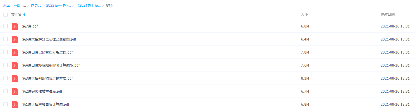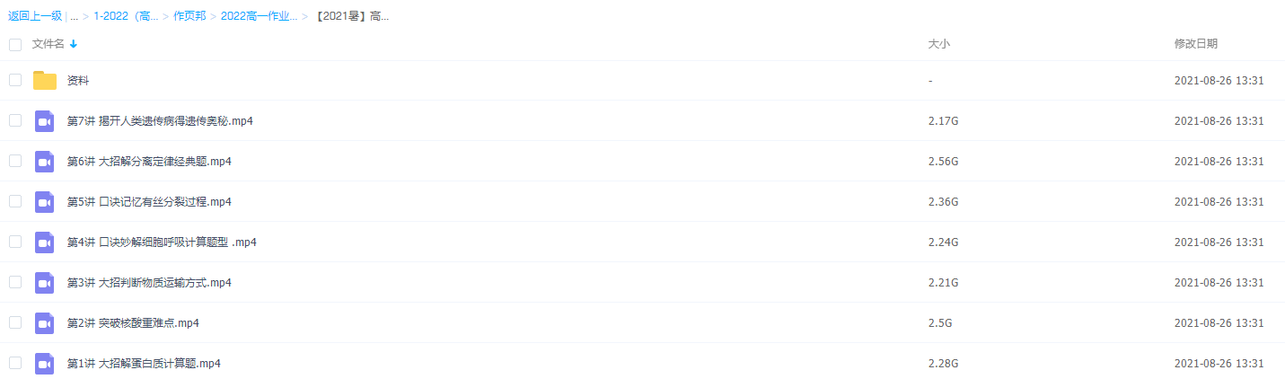 此课件来自作业帮网校,2021高一生物暑假张元振尖端班,包含视频课程和讲义资料 。主讲老师张元振激情幽默,思路清晰,语言简练,方法灵活,总结到位,有效解决学生“会而不明、填而不对”的现象。此课件主要知识点包括:揭开人类遗传病得遗传奥秘、大招解分离定律经典题、口诀记忆有丝分裂过程、口诀妙解细胞呼吸计算题型等视频