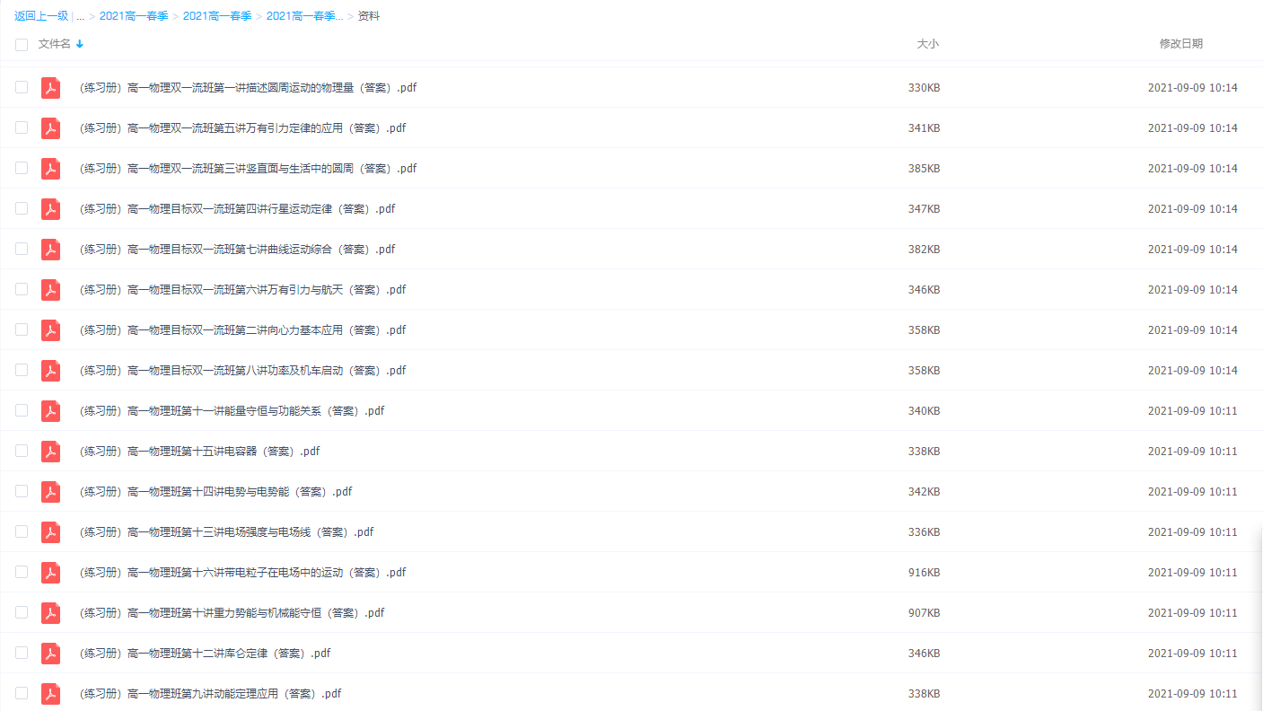 此内容来自于学而思网校,2021学而思高一春季物理章进直播课课程,包括课程视频回放与课堂资料讲义。主要知识点包括描述圆周运动的物理量、向心力基本应用、竖直面与生活中的圆周、行星运动定律、万有引力定律的应用、 万有引力与航天、曲线运动综合、功率及机车启动、动能定理应用等。