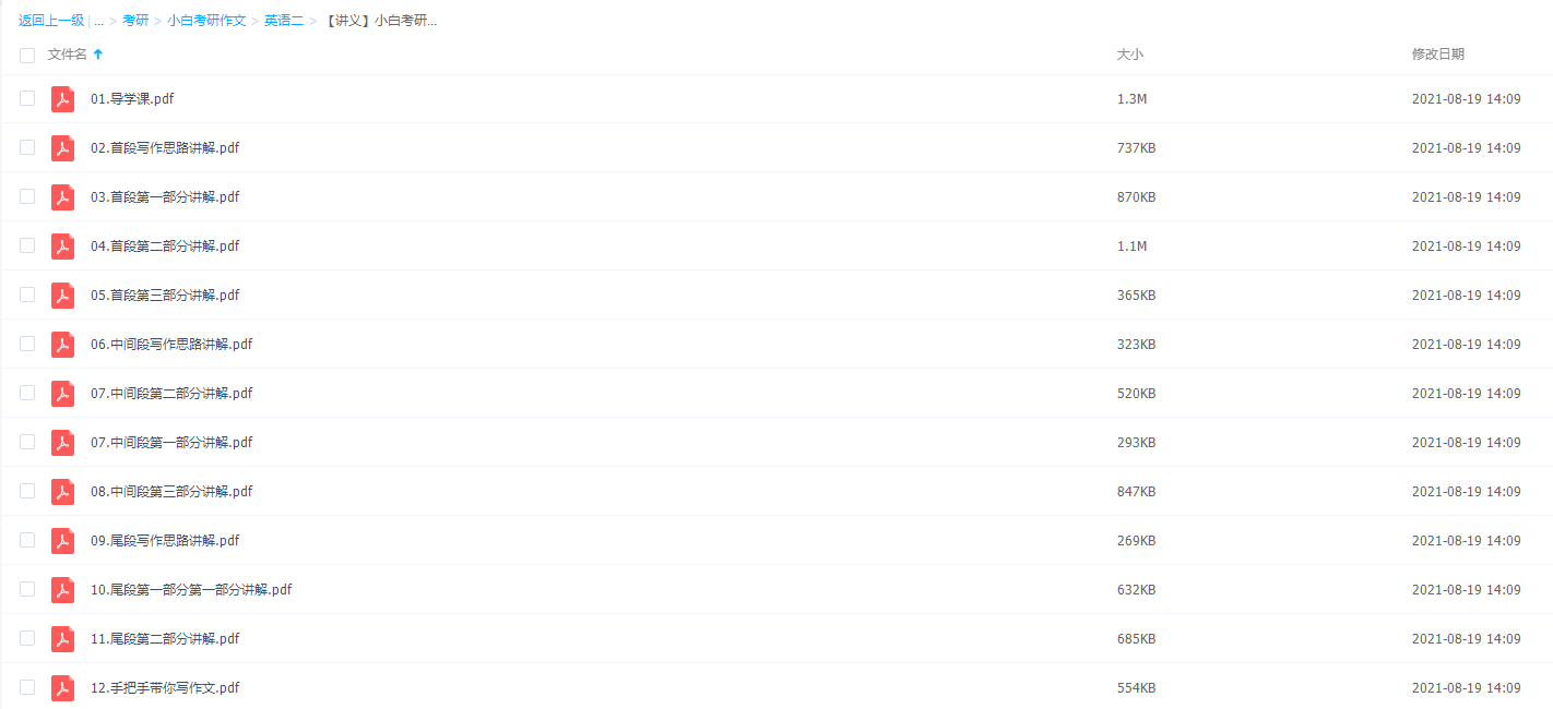 本课件是小白考研作文冲刺训练学习课程,内容包含了很多知识点讲义和讲解教学,可以根据自己不熟悉的地方多多练习!