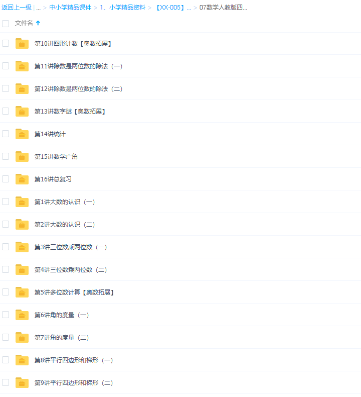 此课件来自学而思网校,人教版小学数学四年级上册16讲。此课件主要知识点包括:大数的认识、三位数乘两位数、多位数计算、角的度量、平行四边形和梯形、图形计数、除数是两位数的除法、数字谜、统计、数学广角、总复习。