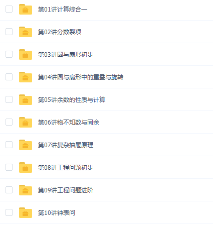 此课件来自高思网校,竞赛小学数学五年级下册知识点讲解视频课程。此课件主要知识点包括:整数数列运算、分数裂项、燕尾模型、位值原理、圆与扇形初步、余数问题、钟表问题、行程问题综合提高、水管问题、正反比例的概念与应用等等视频课程,此课件旨在培养学生分析问题和解决问题的能力,提升学生综合的数学素养。