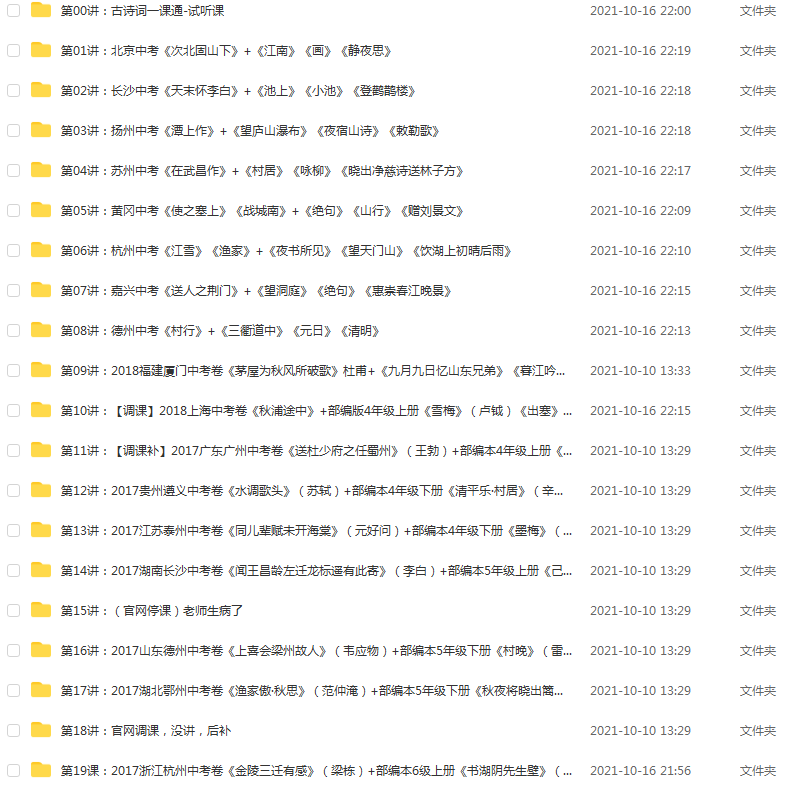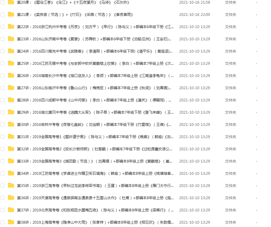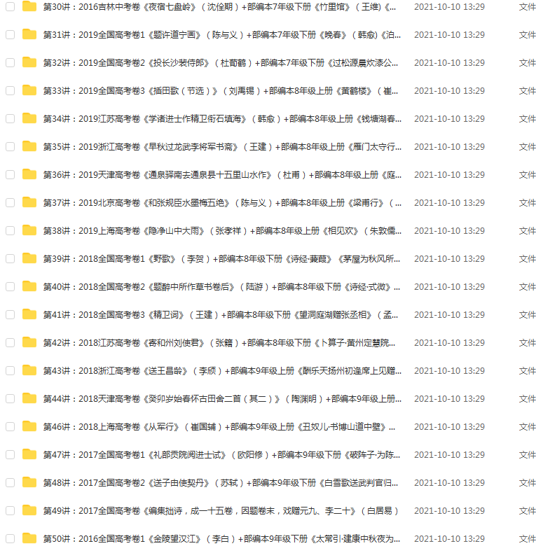 中考实战50讲,涵盖课内所有古诗词,中考必备 本主题由 大大9986 于 2021-11-12 09:31 审核通过 声明:本站资源来自会员发布以及互联网公开收集,不代表本站立场,仅限学习交流使用,请遵循相关法律法规,请在下载后24小时内删除。 如有侵权争议、不妥之处请联系本站删除处理! 请用户仔细辨认内容的真实性,避免上当受骗!
