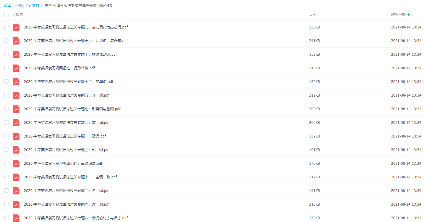 中考必备英语分版块专项重难点突破训练14套语法过关专题测试,想要中考中英语成为提分科目那么你就一定要好好学!